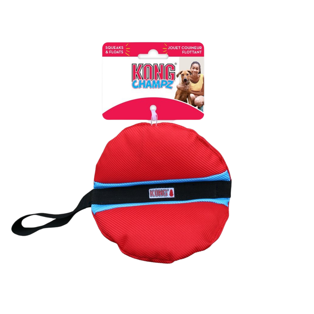 KONG Champz are designed for long-lasting tug and toss play sessions. Featuring handles and a reinforced fabric exterior for added durability, they are great for pups that want to play all day. The squeaker adds to the enjoyment while the ability to float adds to the versatility and fun.