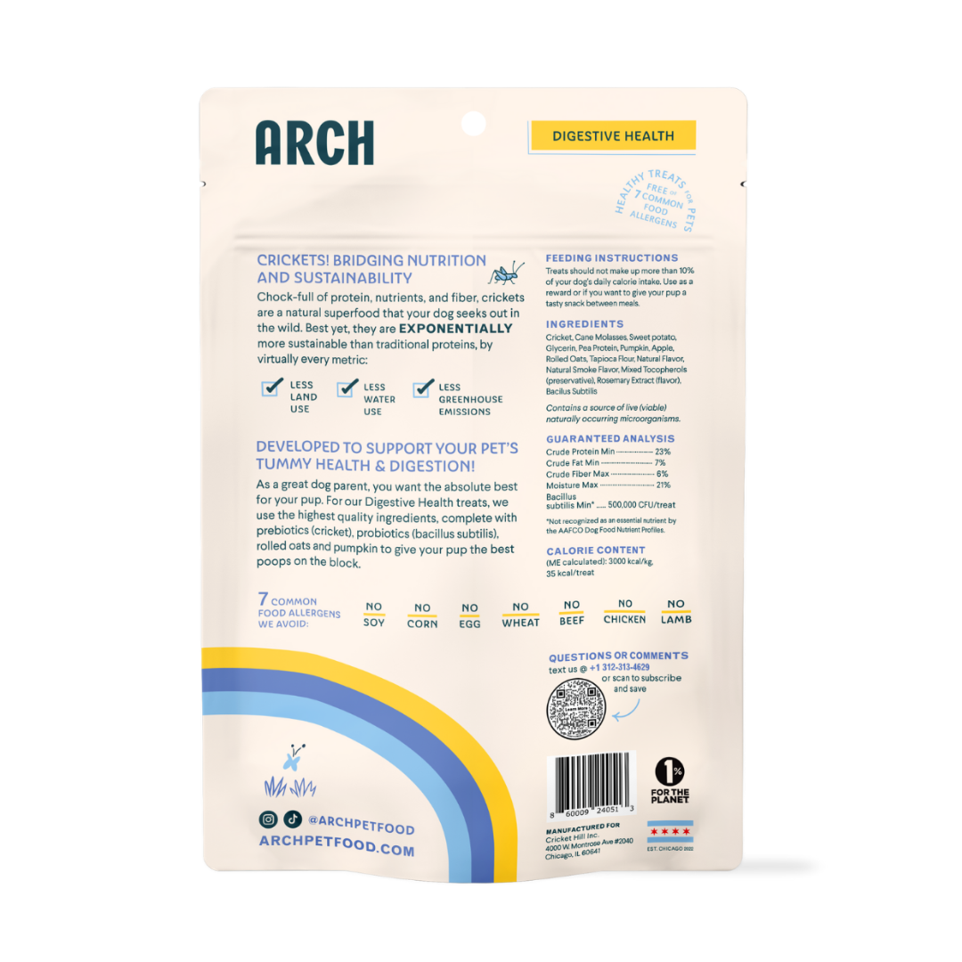 Arch Digestive Health treats use the highest quality ingredients, complete with prebiotics, probiotics, and fresh oats and pumpkin to give your pup the best poops on the block!