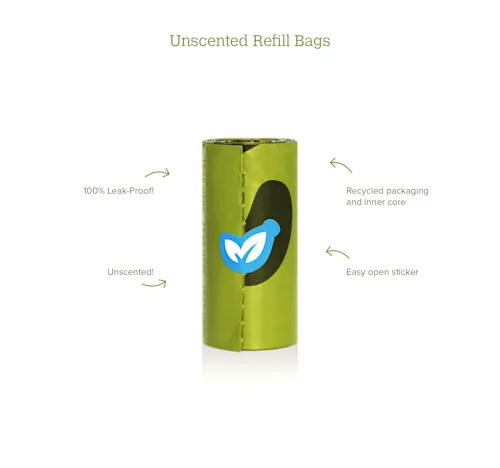 Includes 1 roll of 15 unscented Beco Pets Poop Bags, large, strong, and leak-proof. The Pocket holds all standard dog bag roll refills