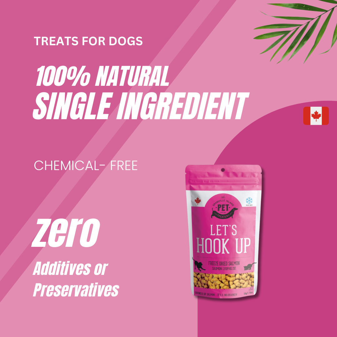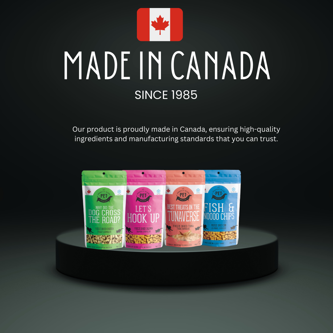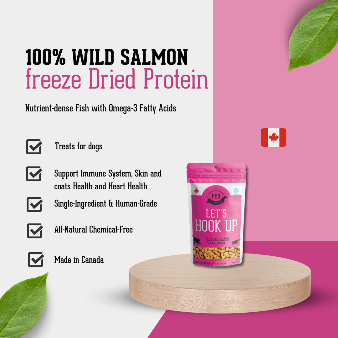 Our delicious freeze dried salmon treats go through a low temperature freeze-drying process that locks in the flavors and nutrients. Dried while raw the taste is irresistible for both cats and dogs. Salmon is an excellent source of protein and our freeze dried treats are perfect for training. Our human grade salmon is sourced in Canada from federally inspected plants.