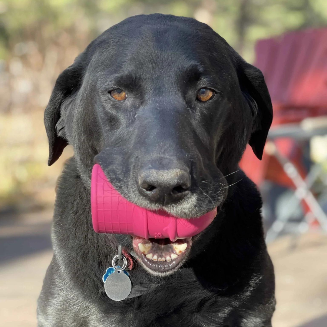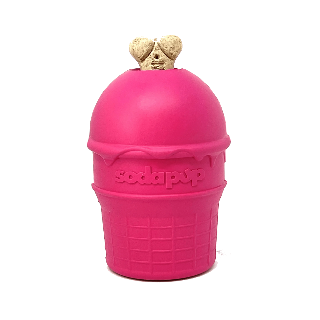 This ice cream cone toy is a treat dispenser and a chew toy designed to withstand the abuse of most tough-chewer dogs. Help your dog fight boredom by filling the can with kibble, treats, peanut butter, or any favorite snack. Try freezing it! The toothed opening helps retain treats, creating a greater challenge for your dog to get at the goodies inside. If your dog is a "speed eater," you can even try serving your dog's meals inside this toy to slow down eating. It helps reduce problem chewing, helps reduce boredom, and relieves separation anxiety. The rubber material is FDA compliant, non-toxic and biodegradable.