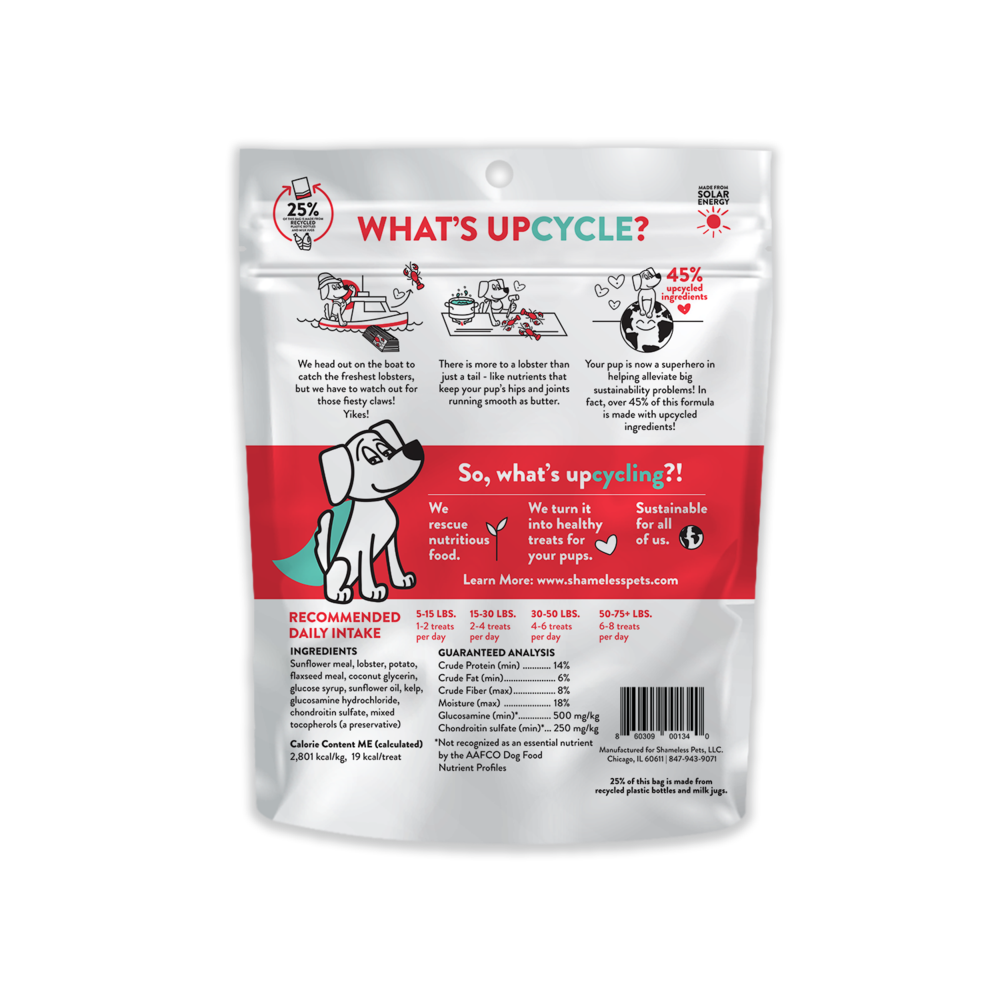 A healthy, and eco-friendly, indulgence! Upcycled lobster treats that are naturally packed with glucosamine, which supports hip and joint health.